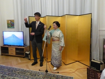 Als Repräsentant der Gäste begrüßte Herr Jiro Nakagawa, der Vorsitzende des Nihonjinkai Hamburg e.V., die Anwesenden und gab ihnen bekannt, dass der Nihonjinkai auch in diesem Jahr das alljährliche Kirschblütenfeuerwerk Ende Mai veranstalten werde. Nach dem gemeinsamen Anstoßen führten die Anwesenden angenehme Gespräche, während ein Informationsvideo über die Olympischen und Paralympischen Spiele 2020 in Tokyo gezeigt wurde.