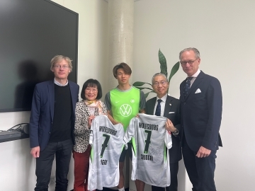 戸田総領事のVfLヴォルフスブルク訪問 令和8年3月19日 3月17日(火)、戸田総領事は、ブンデスリーガ・VfLヴォルフスブルクのホームスタジアム「フォルクスワーゲン・アレーナ」を訪問し、今年1月にVfLヴォルフスブルクに新たに移籍した塩貝健人選手と面会し、激励の言葉を送りました。 塩貝選手は3月末実施予定の国際親善試合に臨むサッカー日本代表メンバーとして初招集されています。